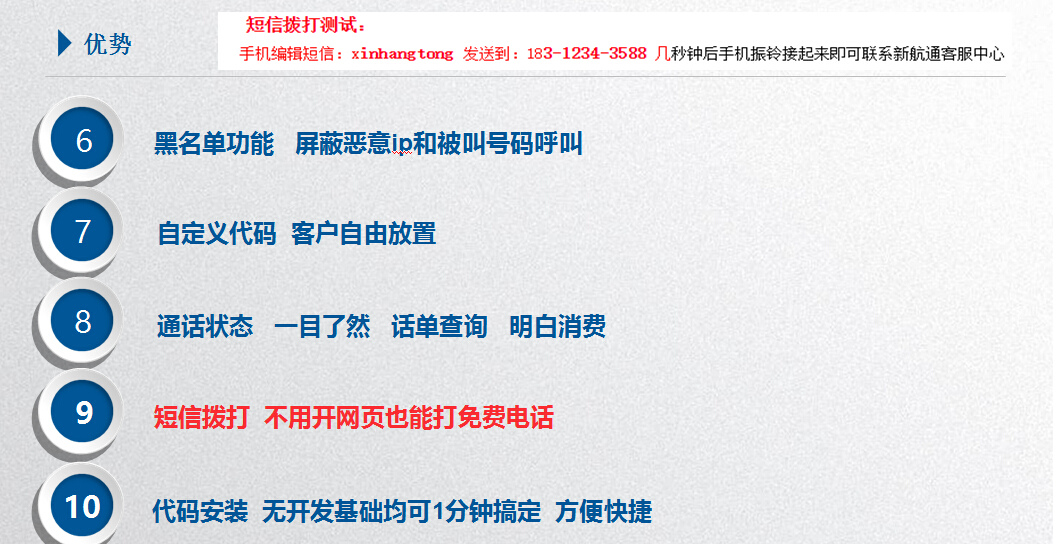 新航通是一家全球性專(zhuān)業(yè)致力于為各類(lèi)企業(yè)提供全面通信解決方案的國際電話(huà)綜合服務(wù)提供商。香港電訊局牌照號為:1488;公司與香港電信、中國聯(lián)通、中國移動(dòng)等多家電信產(chǎn)業(yè)知名公司保持了良好合作關(guān)系。目前公司有10萬(wàn)在線(xiàn)用戶(hù),十年如一 誠信經(jīng)營(yíng),客戶(hù)遍布全球;在深圳和香港都設有分公司,新加坡、加拿大、英國、越南等地設有辦事處;在虛擬電話(huà)方面,已經(jīng)有多年的歷史;是目前為數不多的可提供全球各國各城市電話(huà)號碼和國際800免付號碼最全的供應商之一,公司提供的國際網(wǎng)絡(luò )電話(huà)IDD業(yè)務(wù)撥打話(huà)費低至:中國3分、加拿大3分、美國6分錢(qián)....是您企業(yè)節約通訊成本首選。